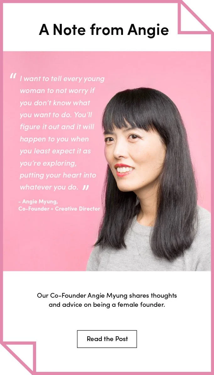 I wrote the surface copy for a capsule collection of tees and convinced the normally behind-the-scenes co-founder Angie to let me interview her, which readers loved.